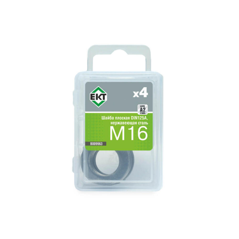 Плоская шайба М16 из нержавеющей стали, соответствующая стандарту DIN 125A. Упаковка содержит 4 штуки.