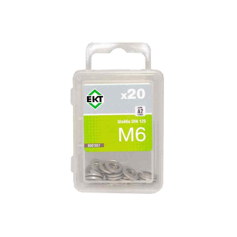 "description": "Шайба плоская М6 из нержавеющей стали, стандарт DIN 125A. Упаковка 20 штук. Бренд ЕКТ. Страна производства: Германия.",