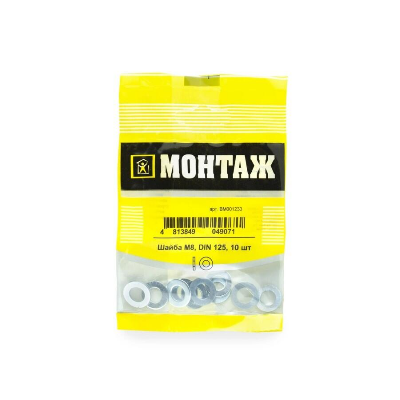 Плоская шайба М8 из оцинкованной стали, соответствующая стандарту DIN 125. Упаковка содержит 10 штук.