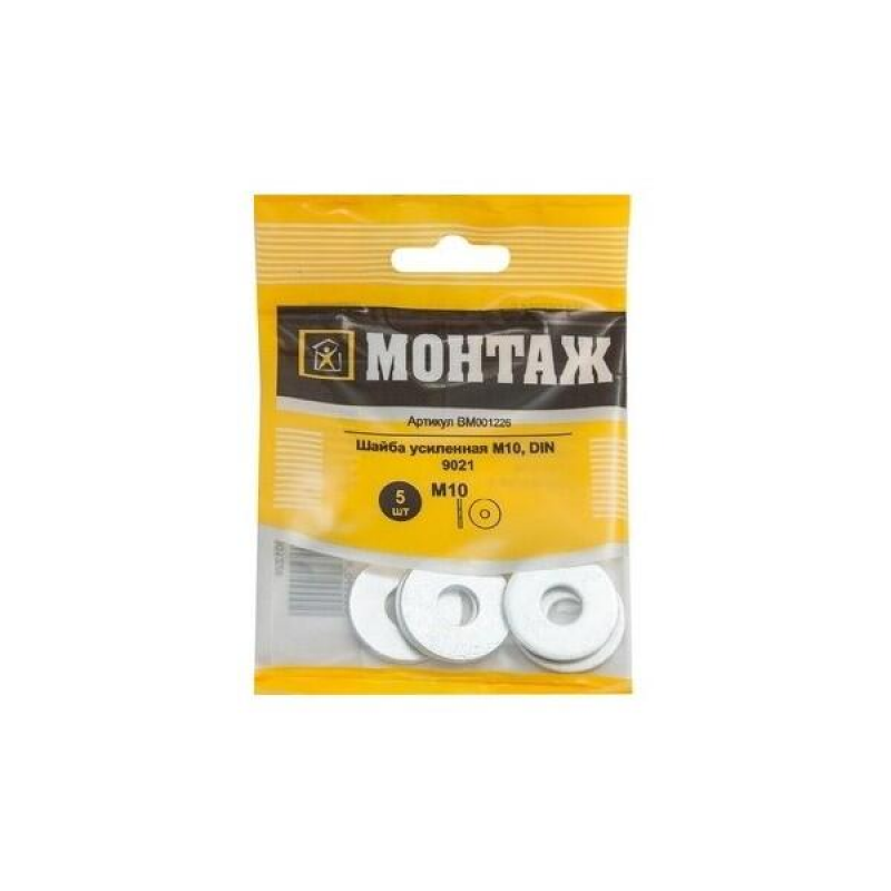 "description": "Усиленная плоская шайба М10 из оцинкованной стали, класс прочности 4.8, стандарт DIN 9021. Упаковка содержит 5 штук. Бренд: Монтаж.",