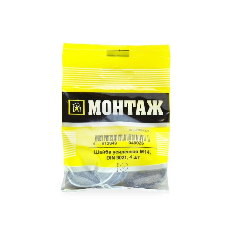 "description": "Усиленная плоская шайба М14 из оцинкованной стали, класс прочности 4.8. Соответствует стандарту DIN 9021. Упаковка содержит 4 штуки. Произведено ООО «ЕКТ Компани» в Китае.",