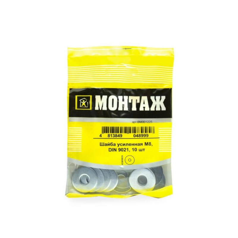 "description": "Шайба плоская усиленная М8 из оцинкованной стали. Соответствует стандарту DIN 9021, класс прочности 4.8. Упаковка содержит 10 штук. Производитель: Монтаж.",