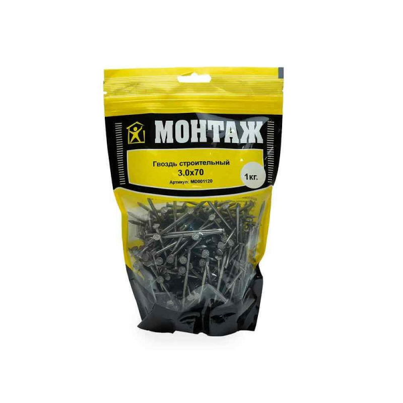 Строительные гвозди 3,0х70 мм из прочной стали от бренда МОНТАЖ. Упакованы в удобный дой-пак. Диаметр: 3 мм. Длина: 70 мм. Вес упаковки: ~1 кг. Произведено в Беларуси.