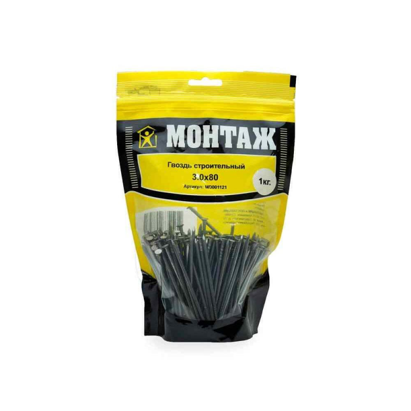 Строительные гвозди 3,0х80 мм из прочной стали. Упакованы в удобный дой-пак весом 1 кг. Продукция бренда МОНТАЖ, производитель — ООО «ЕКТ Компани», Беларусь.