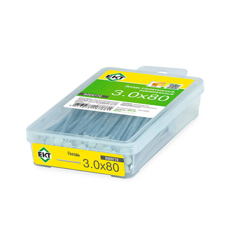 Строительный гвоздь диаметром 3.0 мм и длиной 80 мм. Изготовлен из прочной стали с антикоррозийным цинковым покрытием. Упакован в удобный пластиковый контейнер. Вес упаковки: 0.4 кг.