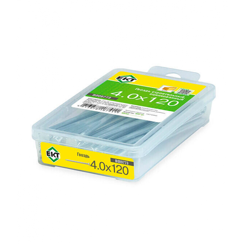 Строительный гвоздь 4.0х120 мм из оцинкованной стали. Упакован в удобный пластиковый контейнер для сохранности и простоты хранения. Вес упаковки 0.4 кг. Произведен в Беларуси компанией ЕКТ.