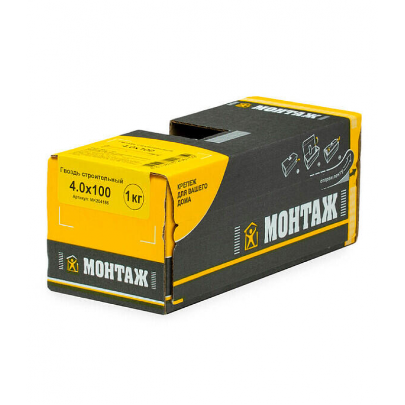 Гвоздь строительный 4.0x100 мм от бренда МОНТАЖ. Изготовлен из прочной стали, оцинкован для защиты от коррозии. Диаметр: 4 мм, длина: 100 мм. Упакован в удобную картонную коробку весом 1 кг. Произведен на заводе ОАО 'Речицкий метизный завод' в Беларуси с соблюдением строгих стандартов качества.