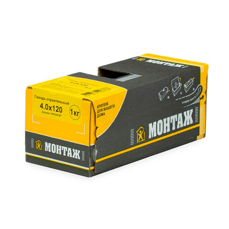 Строительный гвоздь 4.0x120 мм от бренда МОНТАЖ. Изготовлен из прочной стали, оцинкован для защиты от коррозии. Упакован в удобную картонную коробку весом 1 кг. Произведен в Беларуси на ОАО 'Речицкий метизный завод', что гарантирует высокое качество продукции.