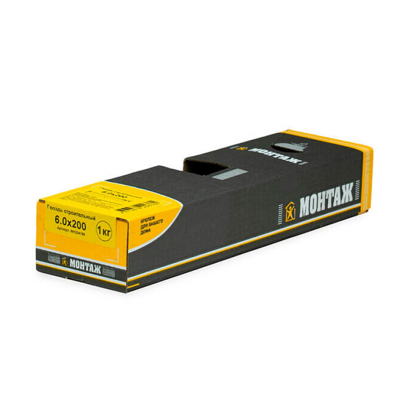 Строительный гвоздь 6.0x200 мм от бренда МОНТАЖ. Изготовлен из прочной стали, имеет классический серебристый цвет. Упакован в удобную картонную коробку. Произведен на заводе ОАО 'Речицкий метизный завод' в Беларуси. Фасовка: упаковка 1 кг.