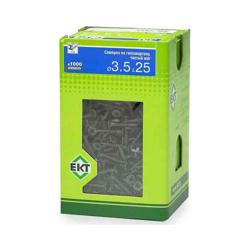 Саморез для гипсокартона по металлу 3,5х25 мм, частый шаг резьбы (1.4-1.7 мм). Острый наконечник, фосфатированное покрытие. Упаковка: картонная коробка с окном, 1000 штук.
