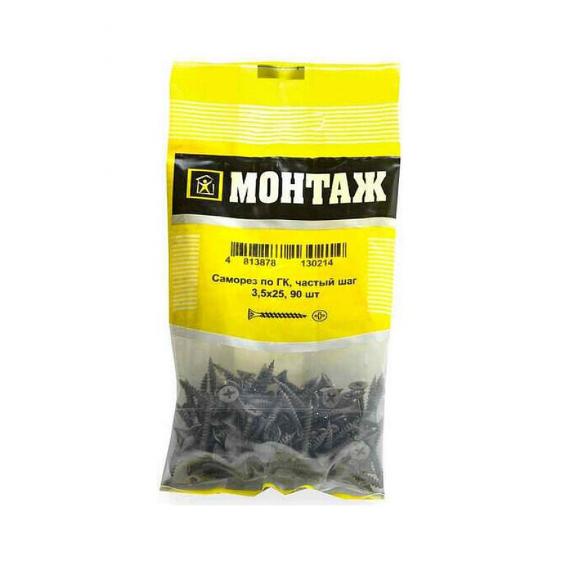 Саморез для гипсокартона и металла. Диаметр: 3.5 мм, длина: 25 мм. Материал: сталь с острым наконечником. Шаг резьбы: 1.4-1.7 мм. Упаковка: пакет 90 шт. Производитель: EKT (Беларусь). Вес: 0.1 кг.