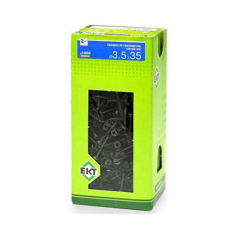Саморез для гипсокартона с частым шагом резьбы (1.4-1.7 мм), предназначенный для крепления к металлическим поверхностям. Размер: 3.5х35 мм. Фосфатированное покрытие. Острый наконечник. Упаковка: картонная коробка с окном (1000 шт).