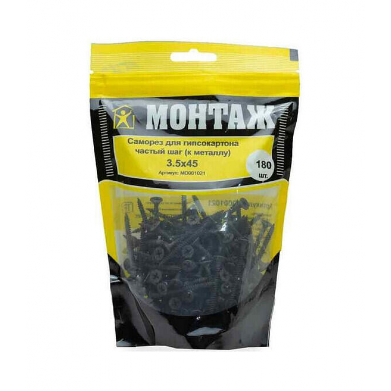 Саморез для гипсокартона МОНТАЖ 3,5х45 мм, частый шаг резьбы (1.4-1.7 мм). Острый наконечник, сталь. Упаковка: 180 шт. в пакете. Вес: 0.414 кг. Производитель: ООО «ЕКТ Компани», Беларусь.
