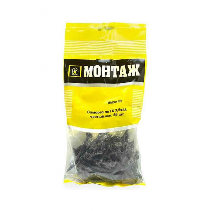 Саморез EKT 3,5х45 мм для крепления гипсокартона к металлическим профилям. Частый шаг резьбы (1.4-1.7 мм), острый наконечник, сталь. Упаковка: 55 шт.