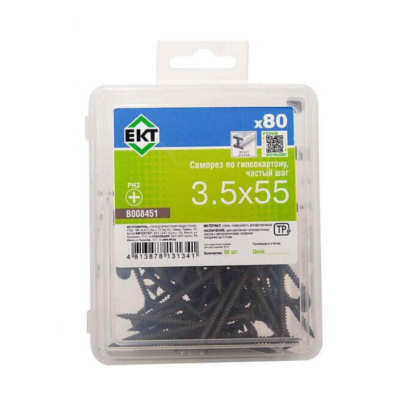 Саморез для гипсокартона с частым шагом резьбы 3,5х55 мм. Материал: сталь. Острый наконечник. Упаковка: пластиковый контейнер, 80 штук.