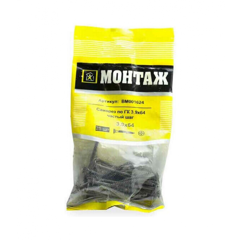 Саморез EKT для гипсокартона и металла, 3.9х64 мм. Частый шаг резьбы 1.4-1.7 мм, острый наконечник. Упаковка: 25 шт. Произведено в Беларуси.