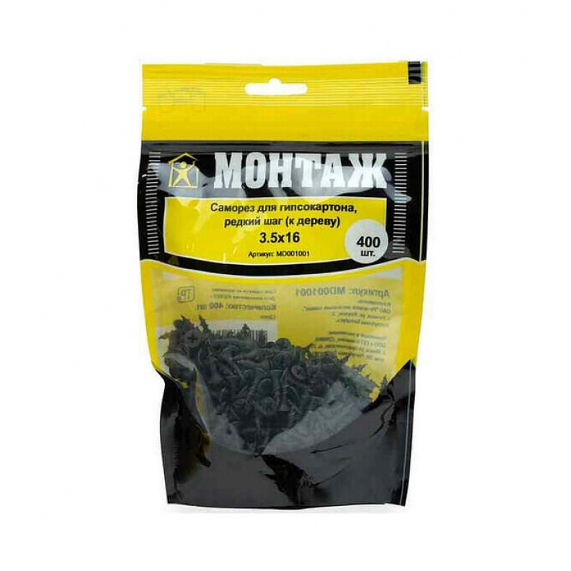 Саморез для гипсокартона по дереву. Бренд: Монтаж. Размер: 3.5х16 мм. Острый наконечник. Крупный шаг резьбы (2.7-2.8 мм). Материал: сталь. Покрытие: фосфат. Упаковка: пакет Дойпак. Количество: 400 шт/уп. Вес упаковки: 0.408 кг. Производитель: ООО «ЕКТ Компани», Беларусь.