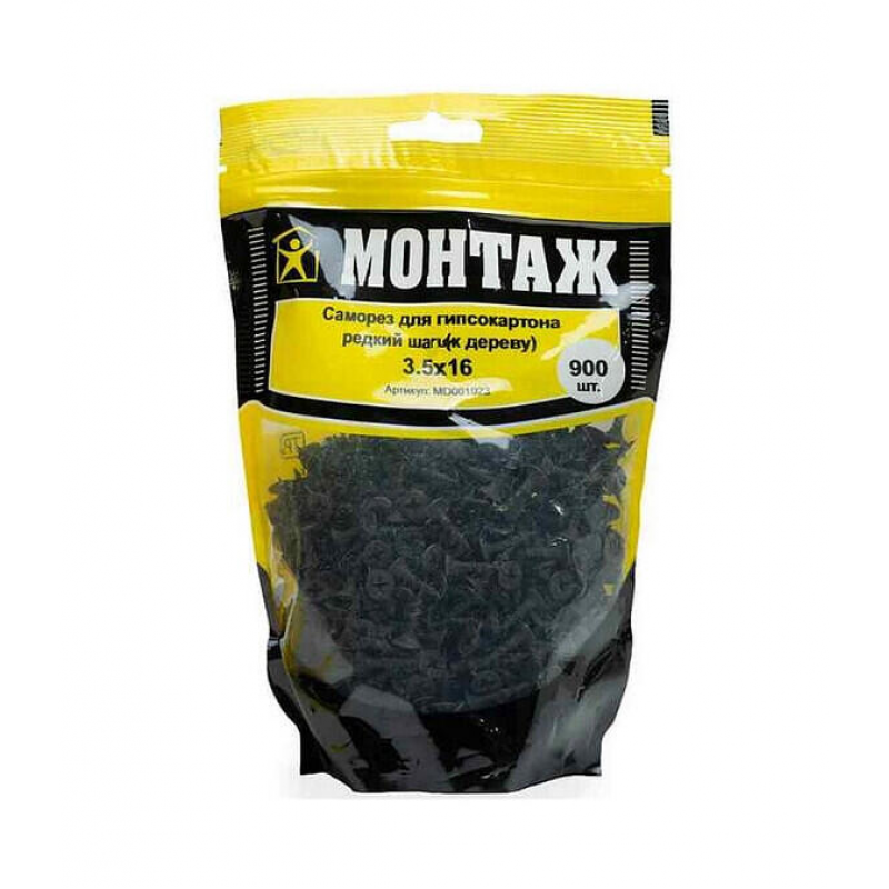 Саморез для крепления гипсокартона к деревянным поверхностям. Диаметр: 3.5 мм, длина: 16 мм. Крупный шаг резьбы (2.7-2.8 мм), острый наконечник. Материал: сталь с фосфатным покрытием. Упаковка: пакет Дойпак, 900 шт., вес 0.91 кг. Произведено в Беларуси.
