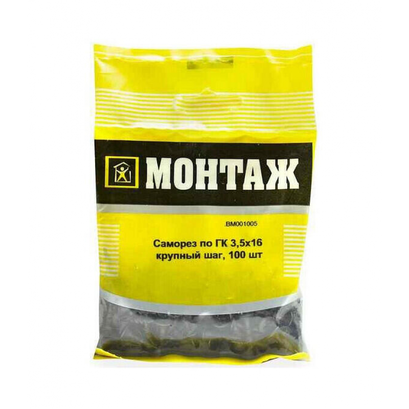 Саморез для крепления гипсокартона к деревянным основаниям. Материал: сталь с фосфатным покрытием. Крупный шаг резьбы (2.7-2.8 мм), острый наконечник, потайная головка PH2. Диаметр: 3.5 мм, длина: 16 мм. Полная резьба. Упаковка: 100 шт.