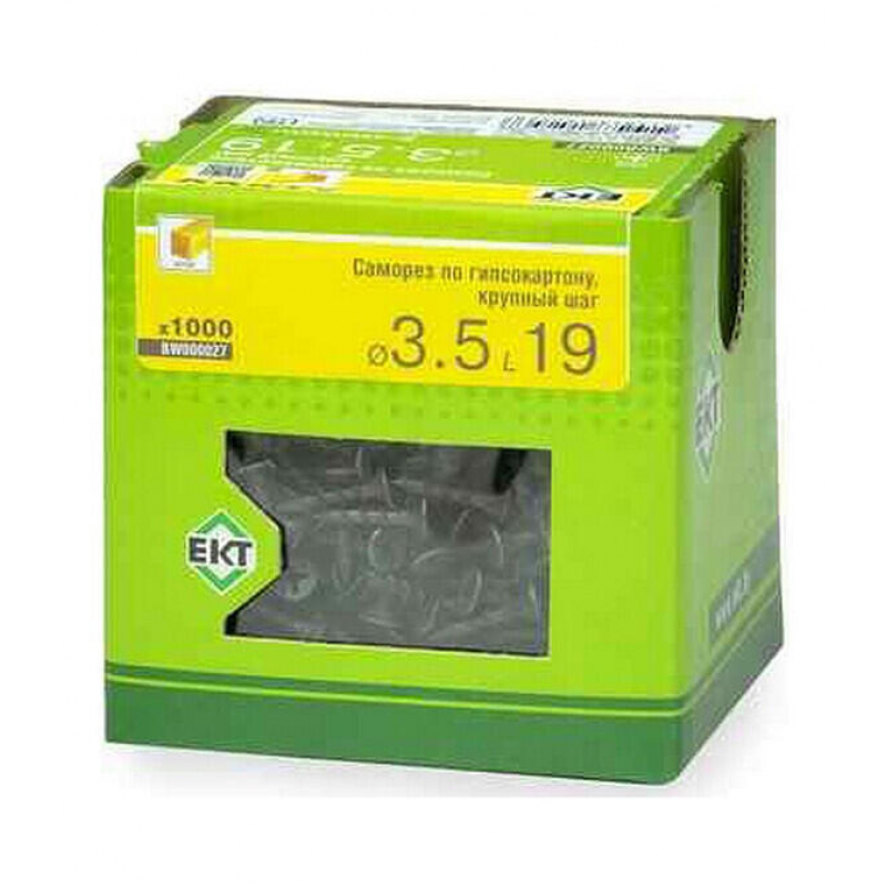 Саморез для гипсокартона и дерева 3,5х19 мм. Крупный шаг резьбы (2.7-2.8 мм), острый наконечник, фосфатированное покрытие. Упаковка: картонная коробка с окном (1000 шт). Бренд: ЕКТ.