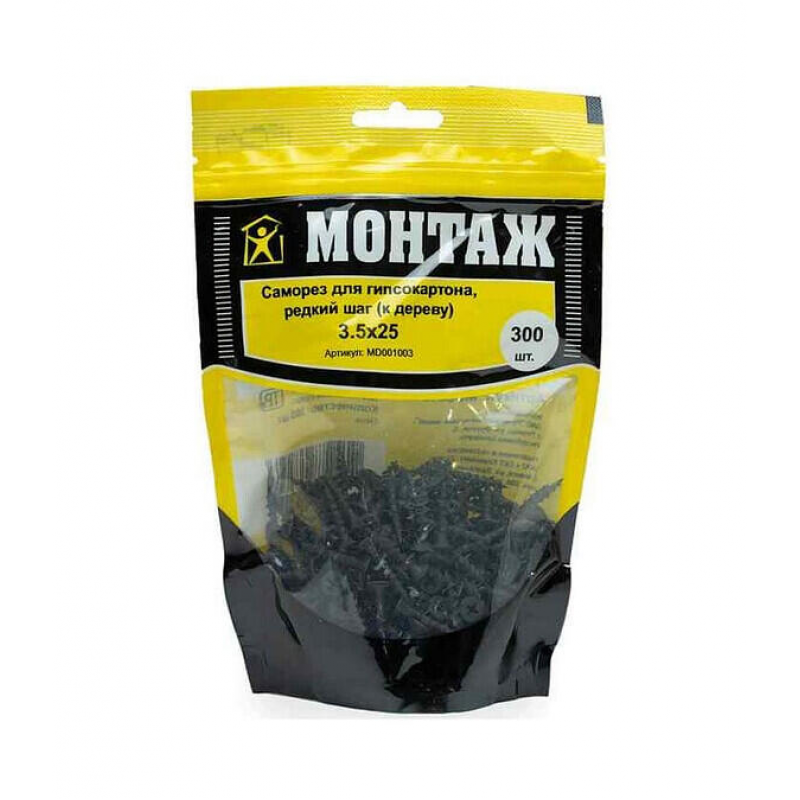 Саморез для гипсокартона по дереву. Размер: 3.5х25 мм. Фосфатное покрытие. Крупный шаг резьбы (2.7-2.8 мм). Острый наконечник. Упаковка: 300 шт в пакете (Дойпак). Производитель: ООО «ЕКТ Компани», Беларусь. Вес упаковки: 0.4 кг.