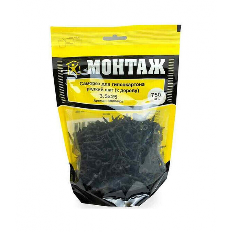 Саморез для гипсокартона по дереву 3.5х25 мм с крупным шагом резьбы (2.7-2.8 мм). Острый наконечник, фосфатное покрытие. Упаковка: 750 шт в пакете. Вес: 1 кг. Производитель: ООО «ЕКТ Компани», Беларусь.