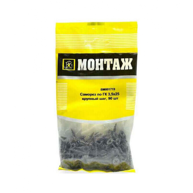 Саморезы для крепления гипсокартона к деревянным основаниям. Размер 3.5х25 мм, крупный шаг резьбы (2.7-2.8 мм), острый наконечник. Упаковка: 90 шт.