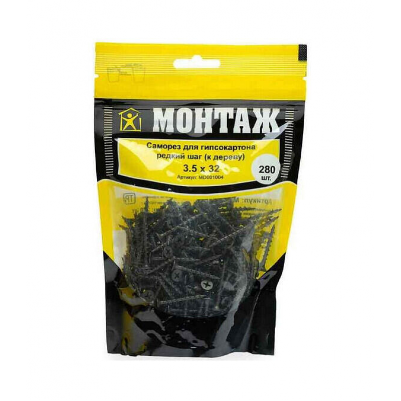 Саморез для гипсокартона по дереву, размер 3.5х32 мм. Материал: сталь с фосфатным покрытием. Острый наконечник, крупный шаг резьбы (2.7-2.8 мм). Упаковка: 280 шт.