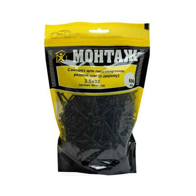 Саморез для гипсокартона по дереву, размер 3.5х32 мм. Крупный шаг резьбы (2.7-2.8 мм), острый наконечник, фосфатное покрытие. Упаковка: 600 шт в пакете Дойпак. Вес: 1.134 кг. Производитель: ООО «ЕКТ Компани», Беларусь.