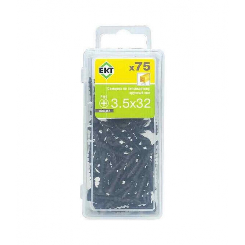 Саморез для крепления гипсокартона к деревянным основаниям. Диаметр 3.5 мм, длина 32 мм. Крупный шаг резьбы (2.7-2.8 мм), острый наконечник. Материал - сталь. Упаковка: пластиковый контейнер, 75 штук. Бренд ЕКТ.