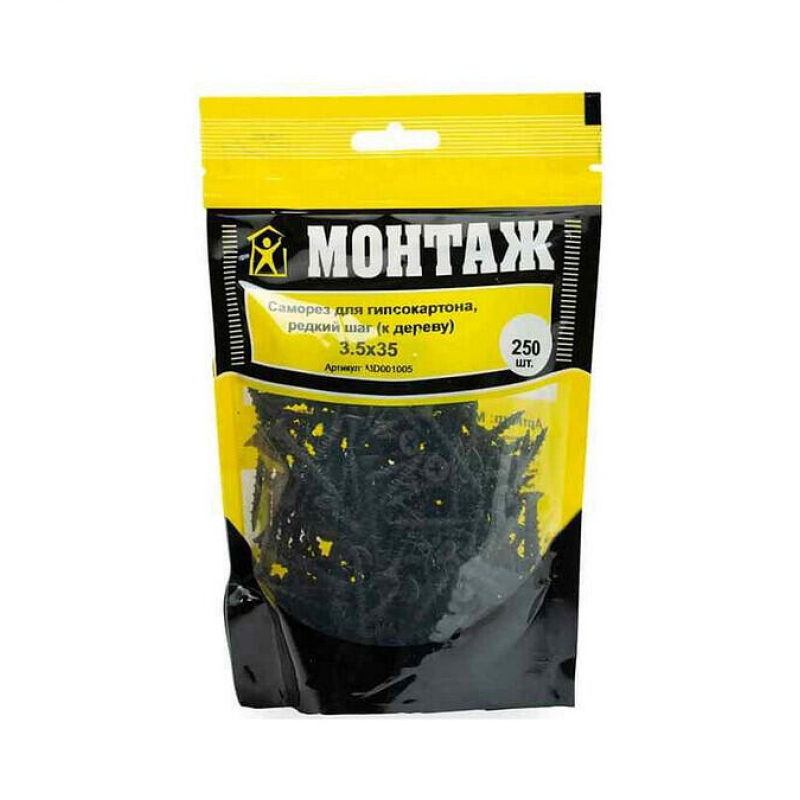 Саморез для гипсокартона и дерева, фосфатированный. Диаметр 3.5 мм, длина 35 мм. Крупный шаг резьбы (2.7-2.8 мм), острый наконечник. Упаковка: пакет Дойпак, 250 шт. Произведено в Беларуси. Вес упаковки: 0.45 кг.