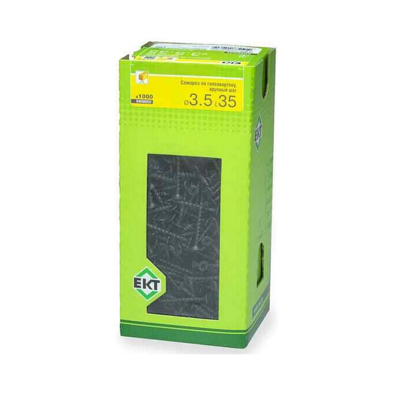 Саморез для крепления гипсокартона к деревянным основаниям. Размер: 3.5х35 мм. Крупный шаг резьбы (2.7-2.8 мм), острый наконечник. Фосфатированное покрытие. Фасовка: 1000 штук в картонной коробке с окном. Бренд: ЕКТ. Произведено в Китае.