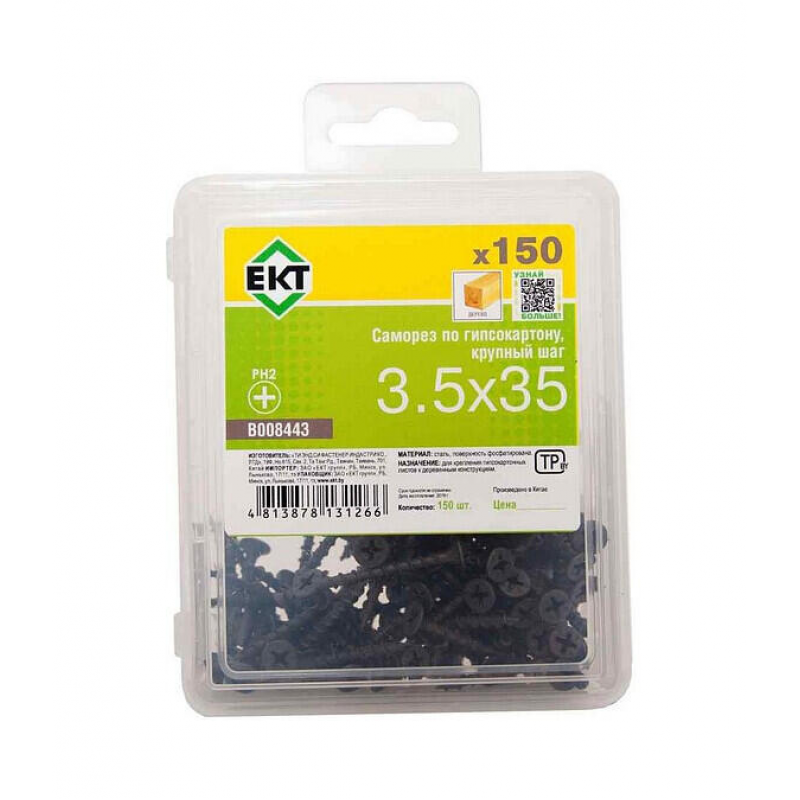 Саморез для гипсокартона по дереву, 3.5х35 мм, острый наконечник. Упаковка: 150 шт в пластиковом контейнере. Бренд: ЕКТ. Материал: сталь.