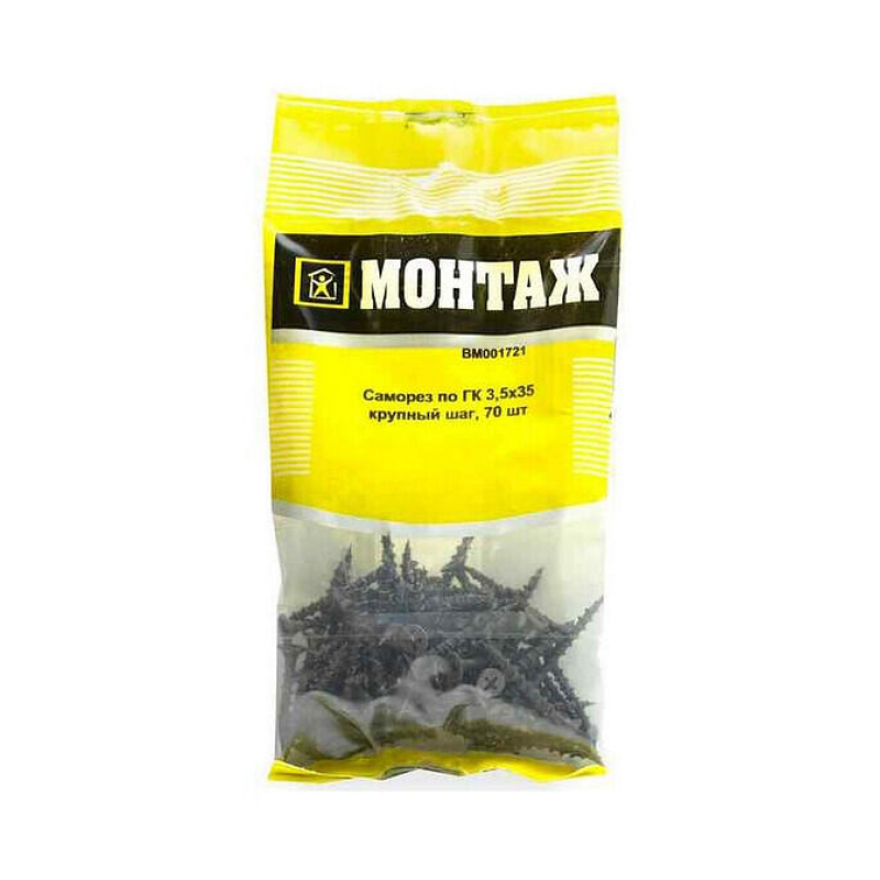 Саморез по гипсокартону для дерева 3,5х35 мм. Бренд: Монтаж. Материал: сталь. Острый наконечник. Крупный шаг резьбы (2.7-2.8 мм). Упаковка: пакет 70 шт. Вес: 0.1 кг. Производитель: ООО «ЕКТ Компани», Беларусь.