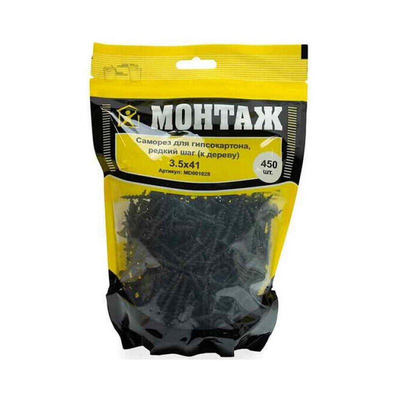 Саморезы для гипсокартона по дереву. Размер: 3.5х41 мм. Материал: сталь. Покрытие: фосфат. Шаг резьбы: крупный (2.7-2.8 мм). Наконечник: острый. Упаковка: пакет Дойпак. Количество: 450 шт. Вес упаковки: 0.92 кг. Бренд: Монтаж. Производитель: ООО «ЕКТ Компани», Беларусь.