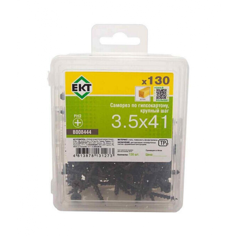 Саморез для гипсокартона по дереву, размер 3.5х41 мм, крупный шаг резьбы (2.7-2.8 мм), острый наконечник. Материал: сталь. Упаковка: пластиковый контейнер (130 шт). Бренд: EKT. Производитель: ООО «ЕКТ Компани», Китай. Вес упаковки: ~0.0025 кг.