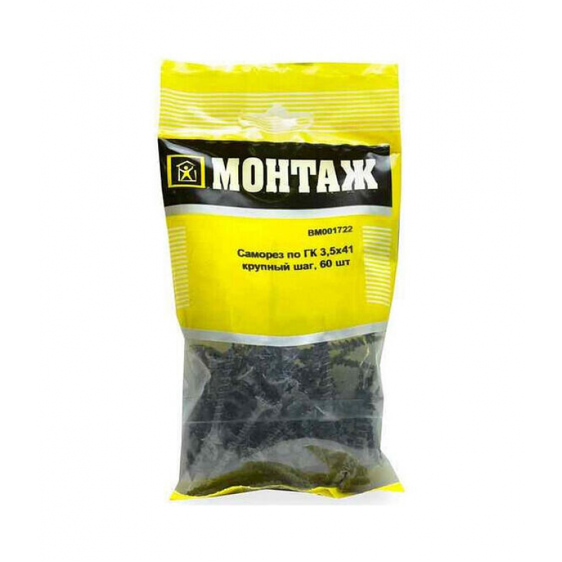Саморез для гипсокартона по дереву Монтаж 3.5х41 мм. Острый наконечник, крупный шаг резьбы (2.7-2.8 мм). Сталь. Упаковка: 60 шт. Вес упаковки: 0.1 кг. Производитель: ООО «ЕКТ Компани», Беларусь.