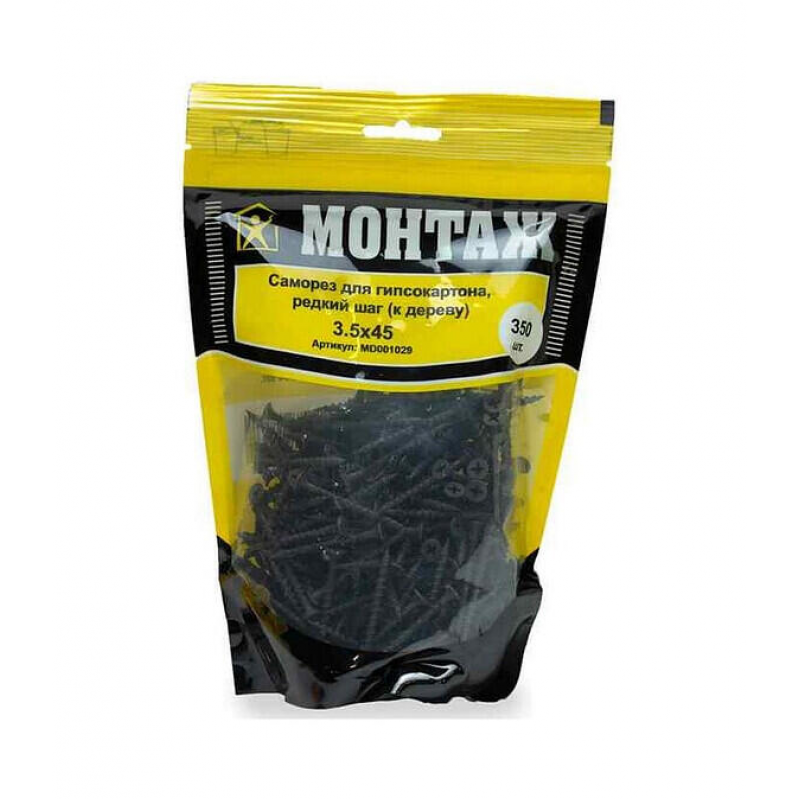 Саморез для гипсокартона по дереву. Размер: 3.5х45 мм. Крупный шаг резьбы (2.7-2.8 мм). Острый наконечник. Фосфатированное покрытие. Упаковка: 350 шт. в пакете. Вес упаковки: 0.77 кг.