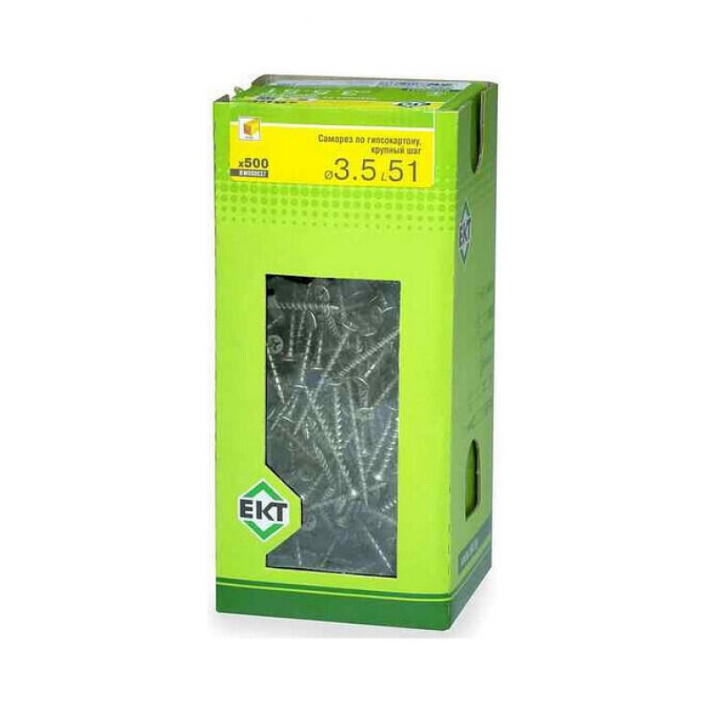Саморез для гипсокартона 3.5х51 мм с крупным шагом резьбы (2.7-2.8 мм) по дереву. Острый наконечник, фосфатированное покрытие. Упаковка: картонная коробка с окном, 500 шт.