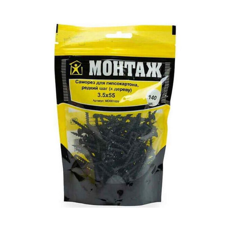 Саморез для крепления гипсокартона к деревянным основаниям. Диаметр: 3.5 мм. Длина: 55 мм. Крупный шаг резьбы (2.7-2.8 мм). Острый наконечник. Фосфатное покрытие. Упаковка: 140 штук.