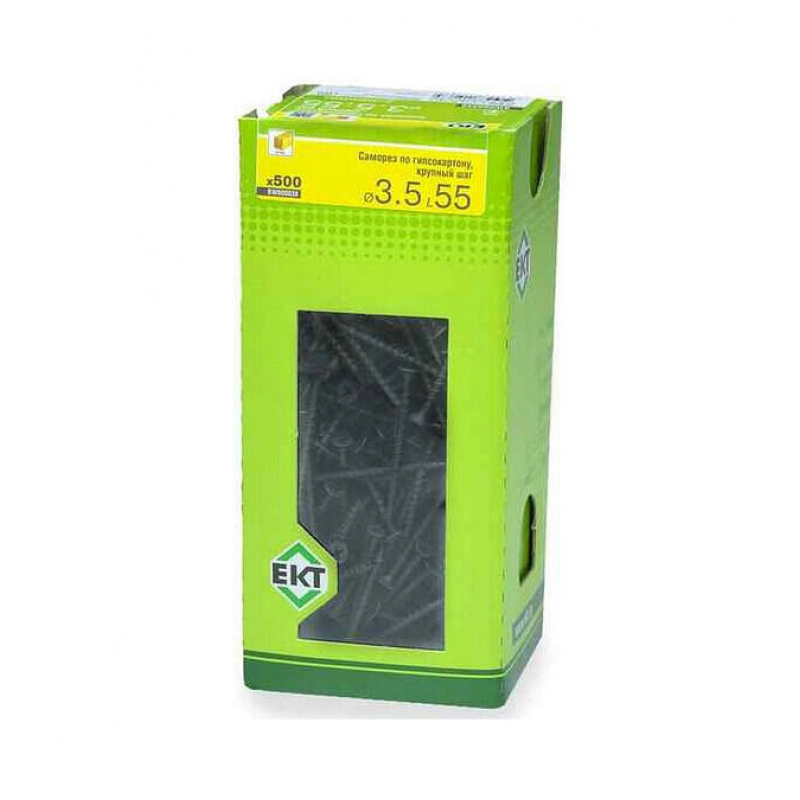 Саморезы ЕКТ 3,5х55 мм для крепления гипсокартона к деревянным основаниям. Крупный шаг резьбы, фосфатированное покрытие. Упаковка: 500 шт в картонной коробке с окном.