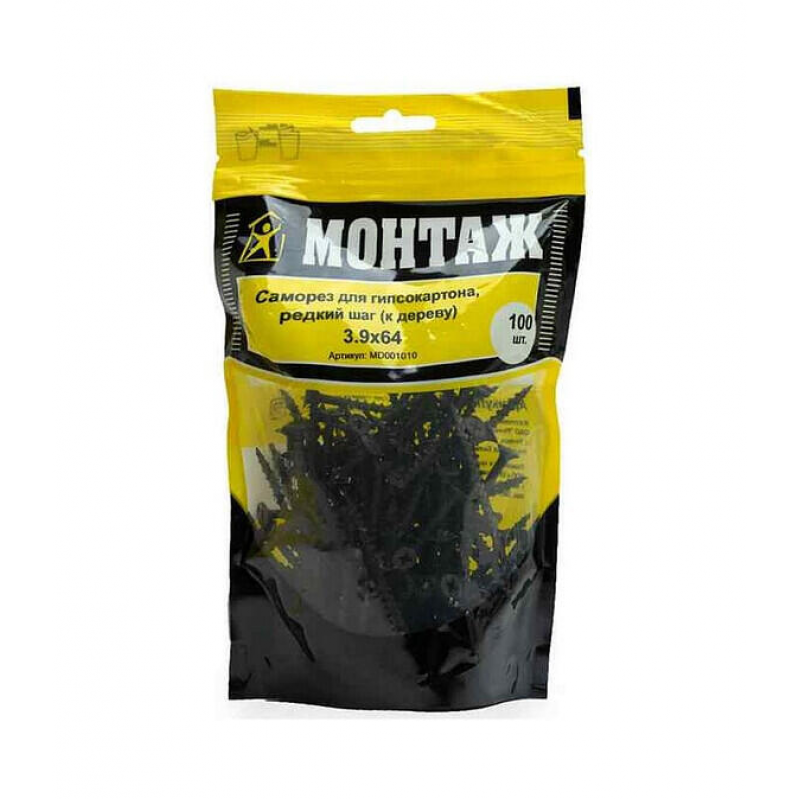 Саморез для гипсокартона и дерева, размер 3.9х64 мм. Фосфатное покрытие. Острый наконечник. Шаг резьбы: 2.7-2.8 мм. Упаковка: 100 шт. Производитель: ООО «ЕКТ Компани», Беларусь. Вес упаковки: 0.381 кг.
