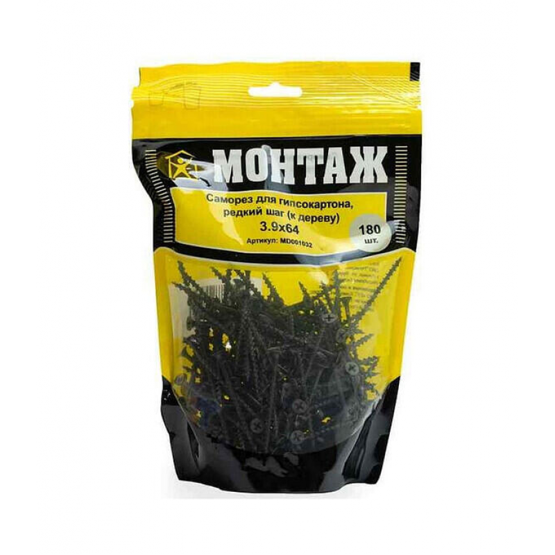 Саморез для гипсокартона и дерева, размер 3.9х64 мм. Острый наконечник, фосфатное покрытие. Крупный шаг резьбы (2.7-2.8 мм). Упаковка: 180 шт в пакете.