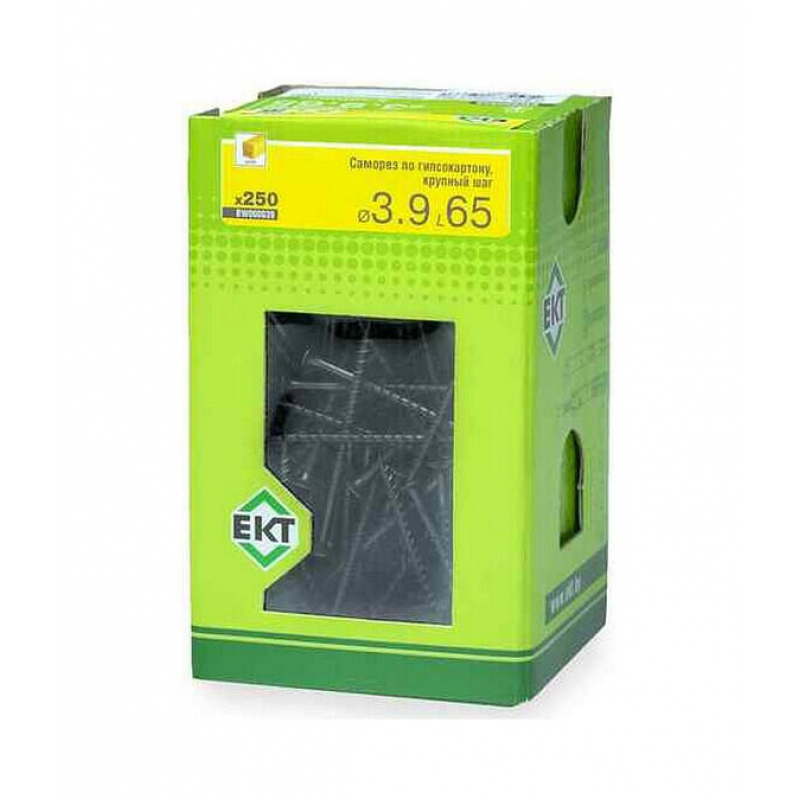 Саморез для гипсокартона и дерева 3.9х65 мм с крупным шагом резьбы (2.7-2.8 мм). Острый наконечник, фосфатированное покрытие. Упаковка: картонная коробка с окном, 250 шт.