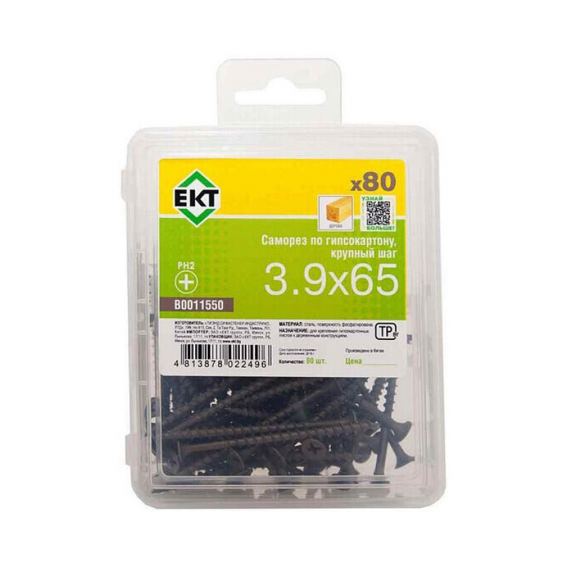 Саморезы ЕКТ для гипсокартона и дерева 3,9х65 мм. Острый наконечник, крупный шаг резьбы (2.7-2.8 мм). Сталь. Упаковка: пластиковый контейнер (80 шт/уп). Вес: 0.05 кг. Производитель: ООО «ЕКТ Компани», Китай.