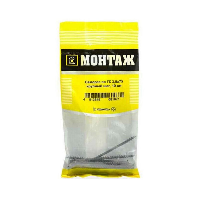 Саморез по гипсокартону и дереву. Размер: 3.9х75 мм. Крупный шаг резьбы (2.7-2.8 мм). Острый наконечник. Материал: сталь. Упаковка: 10 шт.