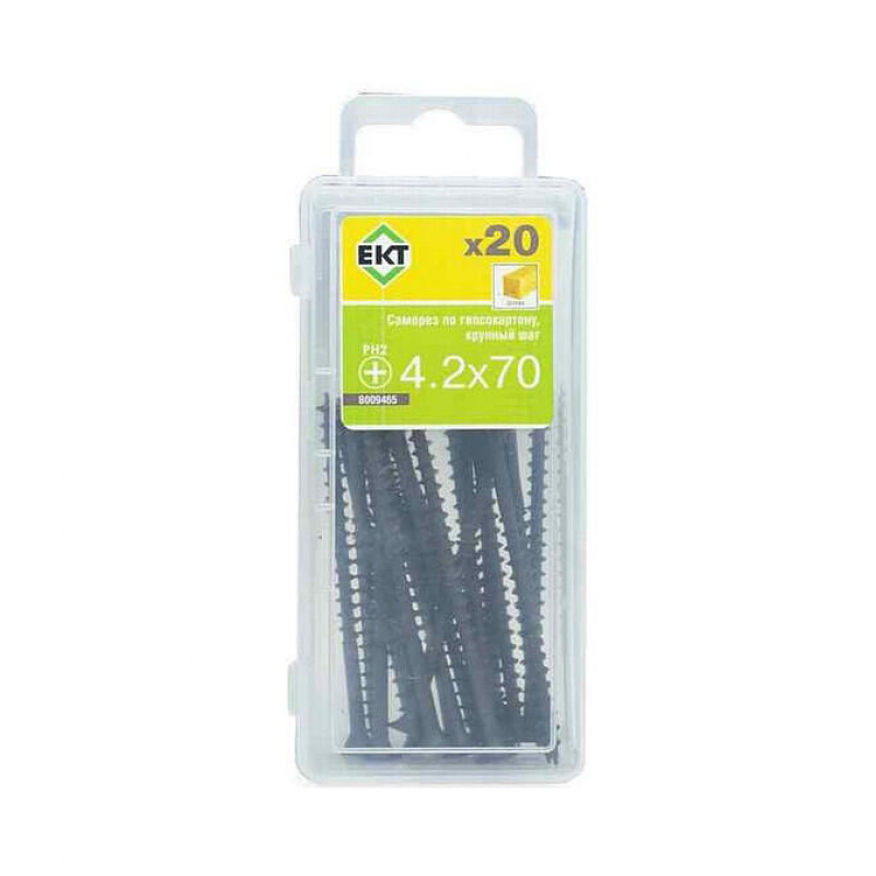 Саморез для гипсокартона по дереву, размер 4.2х70 мм. Крупный шаг резьбы (2.8-2.9 мм), острый наконечник. Материал: сталь. Упаковка: пластиковый контейнер (20 шт).
