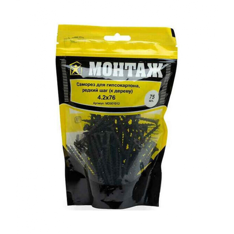 Саморезы для гипсокартона по дереву, 4.2x76 мм, крупный шаг резьбы (2.8-2.9 мм), фосфатированные. Острый наконечник. Сталь. Упаковка: 75 штук. Бренд Монтаж. Производитель: ООО «ЕКТ Компани», Беларусь.