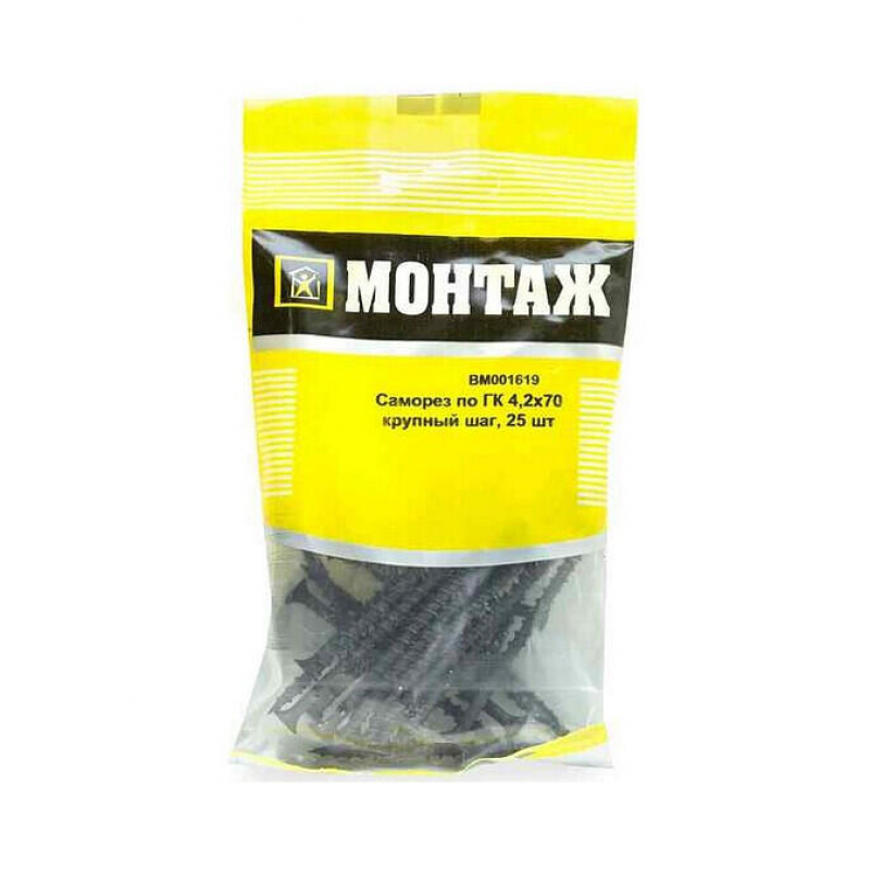 Саморез для гипсокартона с крупным шагом резьбы 4.2x70 мм. Изготовлен из стали с оцинкованной и пассированной поверхностью. Имеет острый наконечник, потайную головку с крестообразным шлицем Pozidrive. Твердость поверхностного слоя 450-750 HV. Упаковка: 25 штук в пакете.