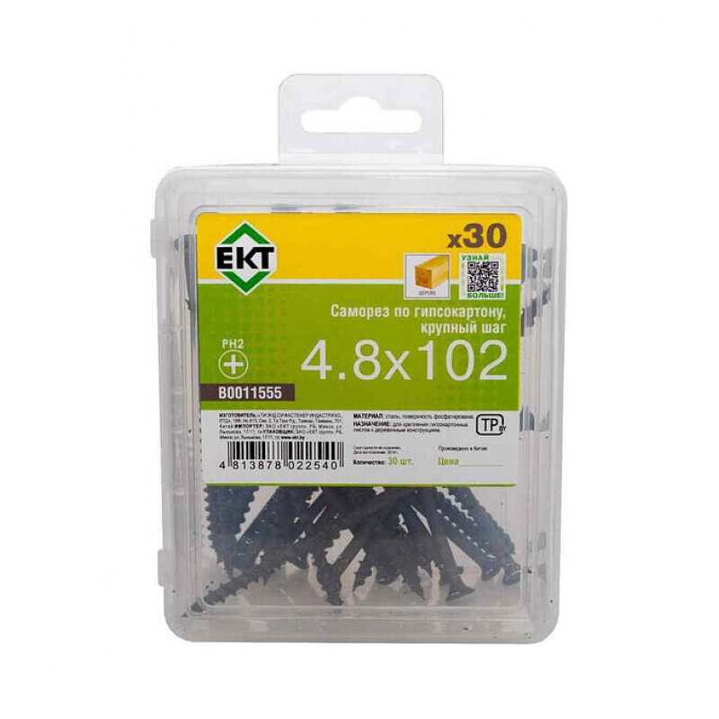Саморез для крепления гипсокартона к деревянным каркасам. Размер: 4.8х102 мм. Крупный шаг резьбы (3.1-3.2 мм). Острый наконечник. Упаковка: пластиковый контейнер (BOX) с 30 штуками.